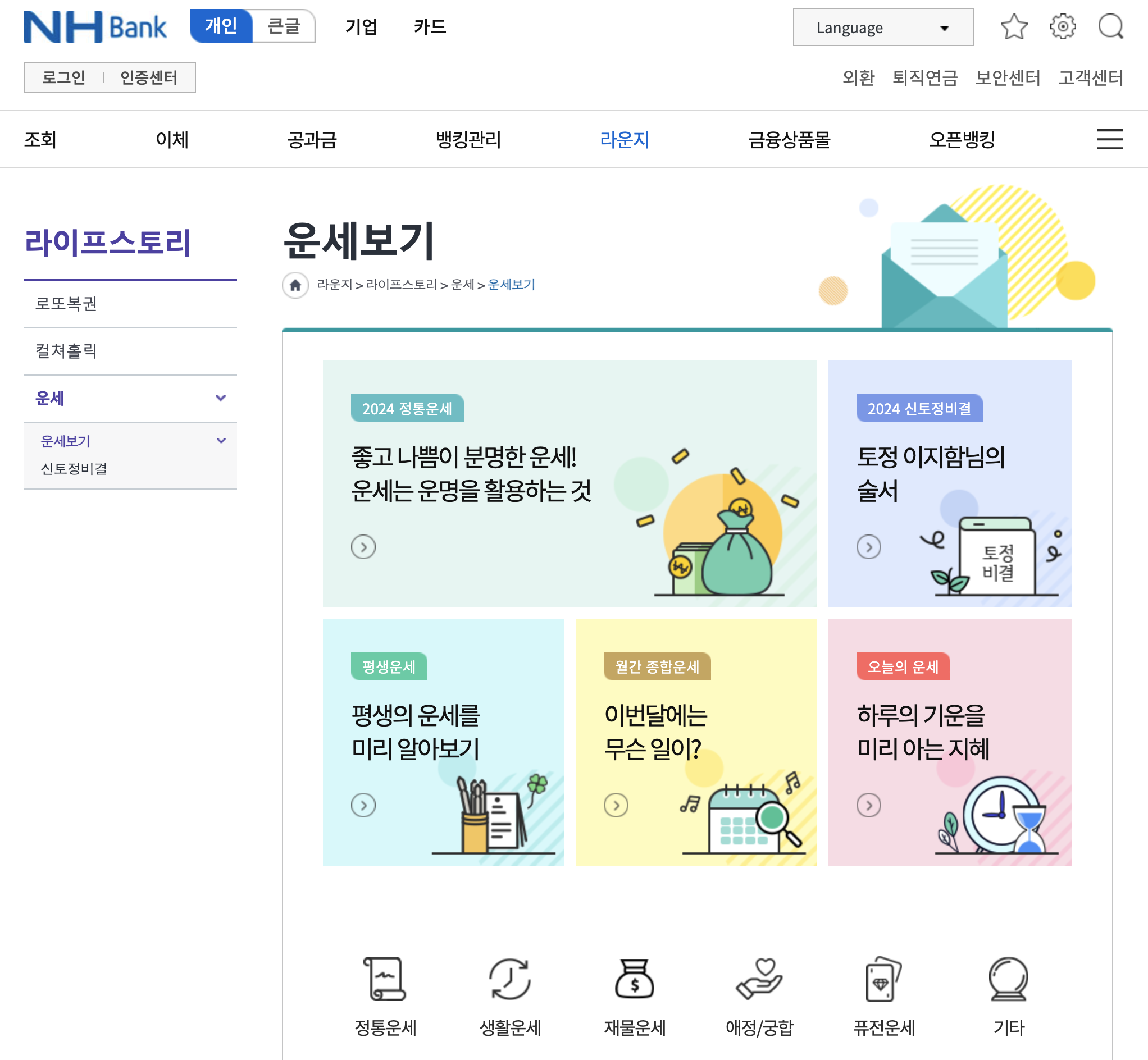 NH Bank 홈페이지에 방문하시면 정통운세, 신토정비결, 평생운세, 월간 종합운세, 오늘의 운세에 대한 서비스를 제공하고 있습니다.